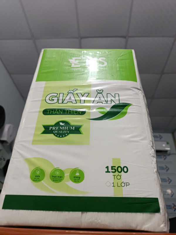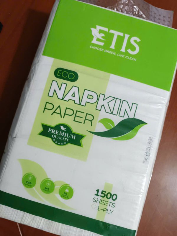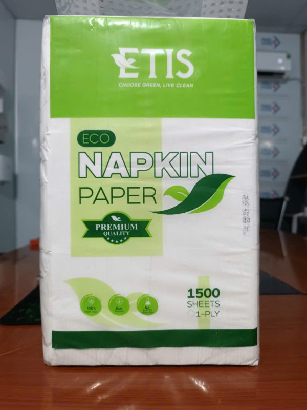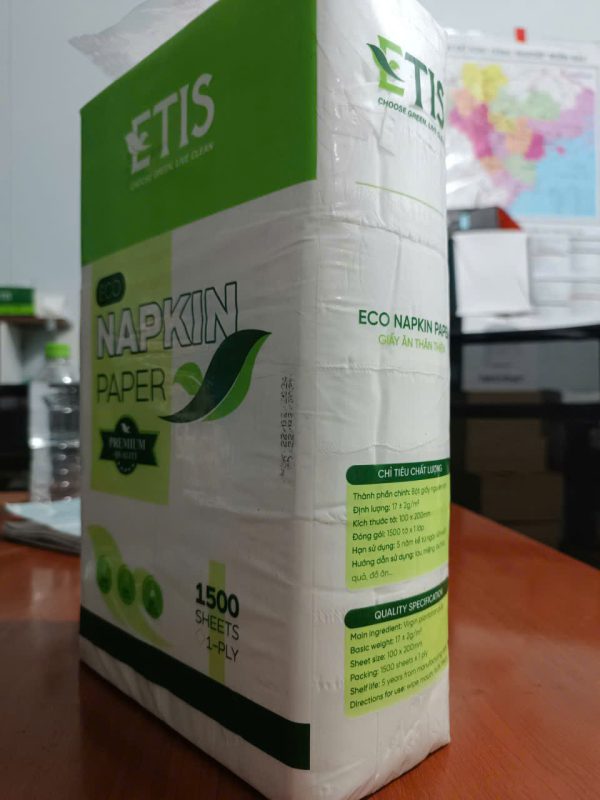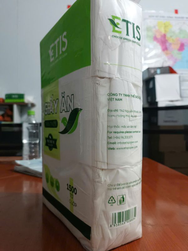 - Chất liệu: Giấy được làm từ nguyên liệu bột giấy cao cấp, có độ mềm mịn, không gây kích ứng da và an toàn cho người sử dụng. Giấy ăn ETIS 1500 có khả năng thấm hút tốt, giúp lau sạch các vết bẩn hay dầu mỡ hiệu quả.